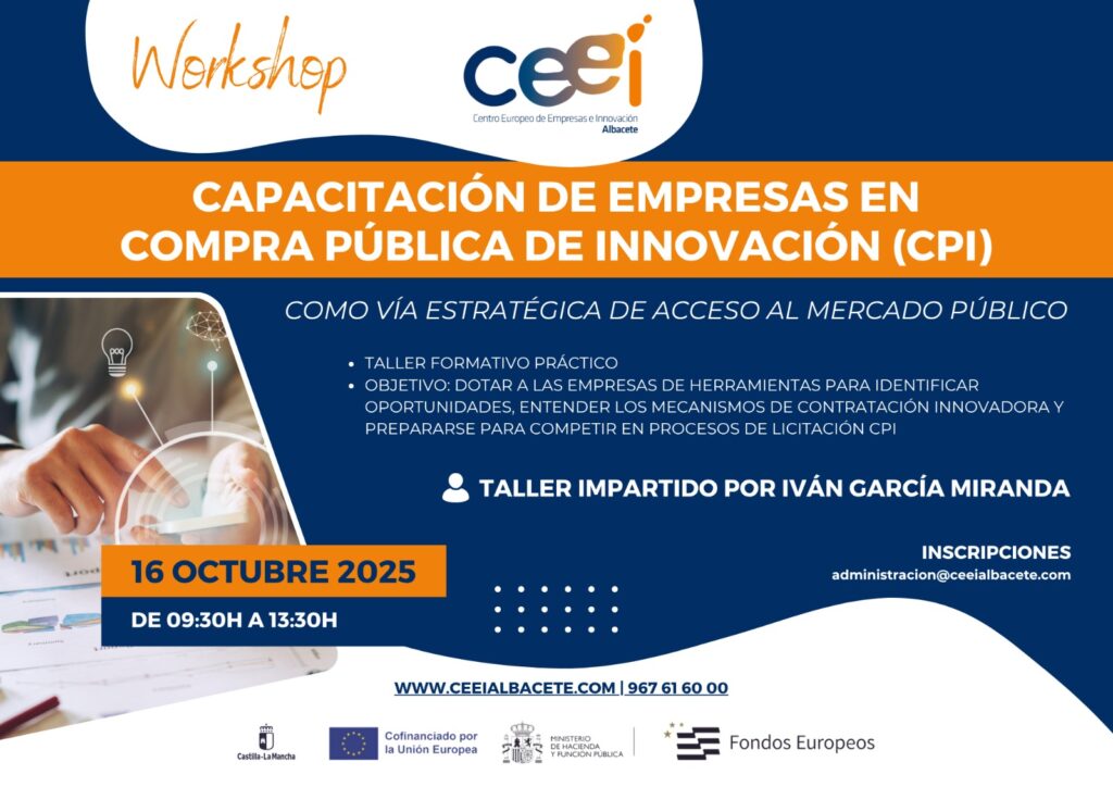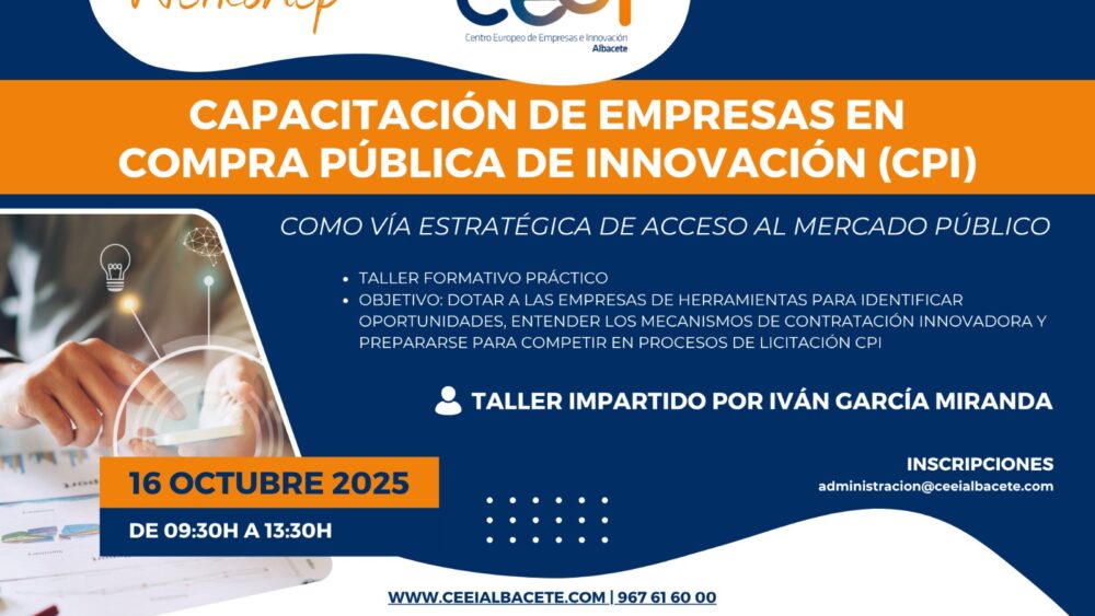 Desde CEEI Albacete te invitamos a participar en el Workshop de Capacitación en Compra Pública de Innovación (CPI), una formación práctica diseñada para empresas innovadoras como la tuya.